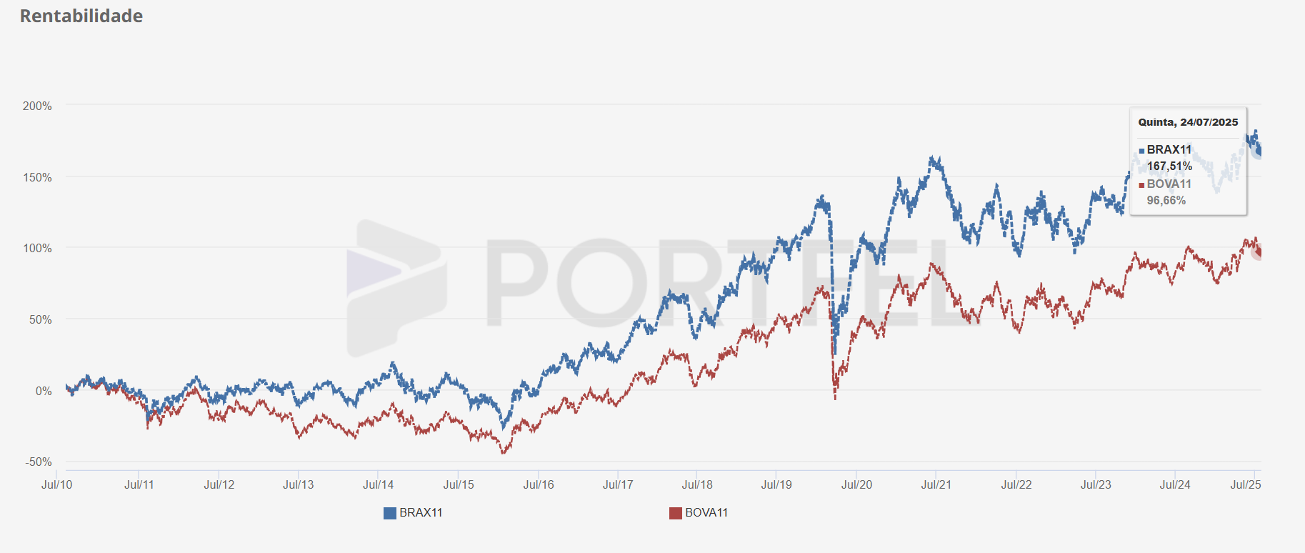 • 24 meses: o BRAX11 tem leve vantagem (9,87% contra 9,79%).